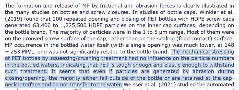 "The mechanical stressing of PET bottles by squeezing/crushing treatment had no influence on the particle numbers in the bottled waters, indicating that PET is tough enough and elastic enough to withstand such treatment. It seems that even if particles are generated by abrasion during closing/opening, the majority either fall outside of the bottle or are retained at the cap- neck interface and do not transfer to the water."